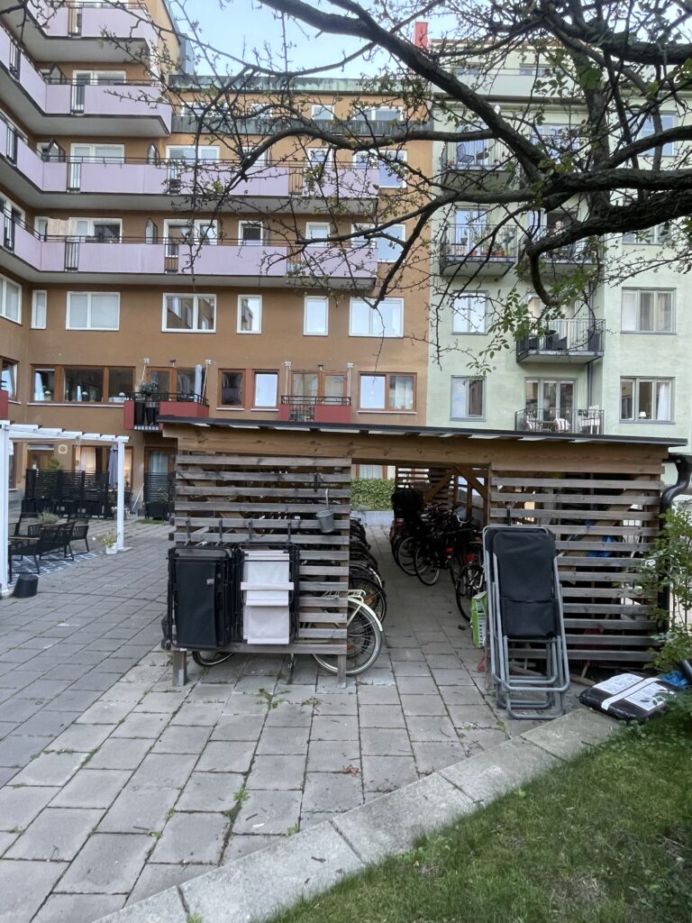 Cyklar kan korttidsparkeras både i cykelrummet på Bergsgatan (dörren bredvid porten till 51:an, öppnas med portnyckel eller tagg) och på förrådet på gården. Använd ingången på Polhemsgatan när du tar cykeln ut eller in på gården.